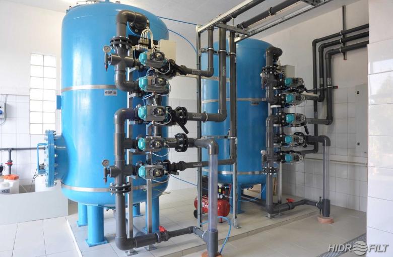 The metal ion content of natural waters can cause deposits, turbidity, increased corrosiveness and, in the case of drinking water, a metallic taste during water consumption. For the removal of iron and manganese, we recommend the use of HF-AMF type pressure equipment with manganese hydroxide-based filling, which keeps the iron content of the treated water below 0.2-0.3 mg/l and the manganese content below 0.1 mg/l. The equipment's filling first catalytically oxidizes the iron and manganese ions, then filters the resulting precipitate out of the water. The contaminants retained during the process are removed by a countercurrent washing operation initiated by a time program and/or pressure difference, during which disinfection and activation of the filling take place. The equipment is automatic and comes in a standard block or individual valve design. The filter columns are made of polyethylene-lined fiberglass polyester (FRG) or surface-treated carbon steel. In the case of a custom valve design, the equipment is controlled and its operation is displayed by a Unitronics PLC-HMI unit.